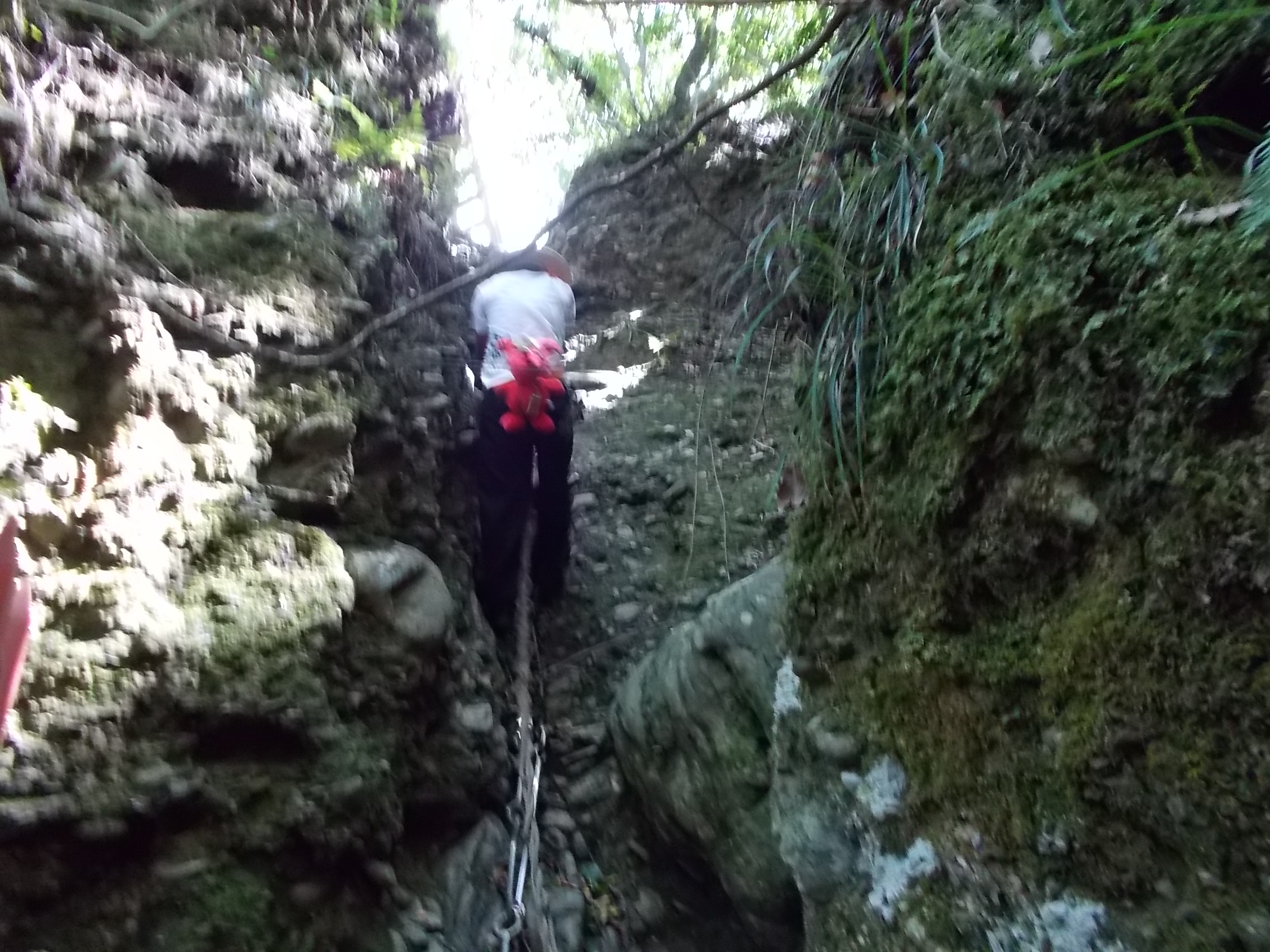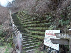 暫く歩くと歯長峠への登り口に到着した。ここに「きついのは最初だけ、峠まで20分」と書かれた看板がある。短い階段を上ると休憩所があったので、この階段が、最初のきつい所と思ったが間違いであった。10分程歩くと鎖場に差し掛かる。きついのは、最初だけではなく、7,8分程の鎖場が相当にきつかった。息も絶え絶えで上った。