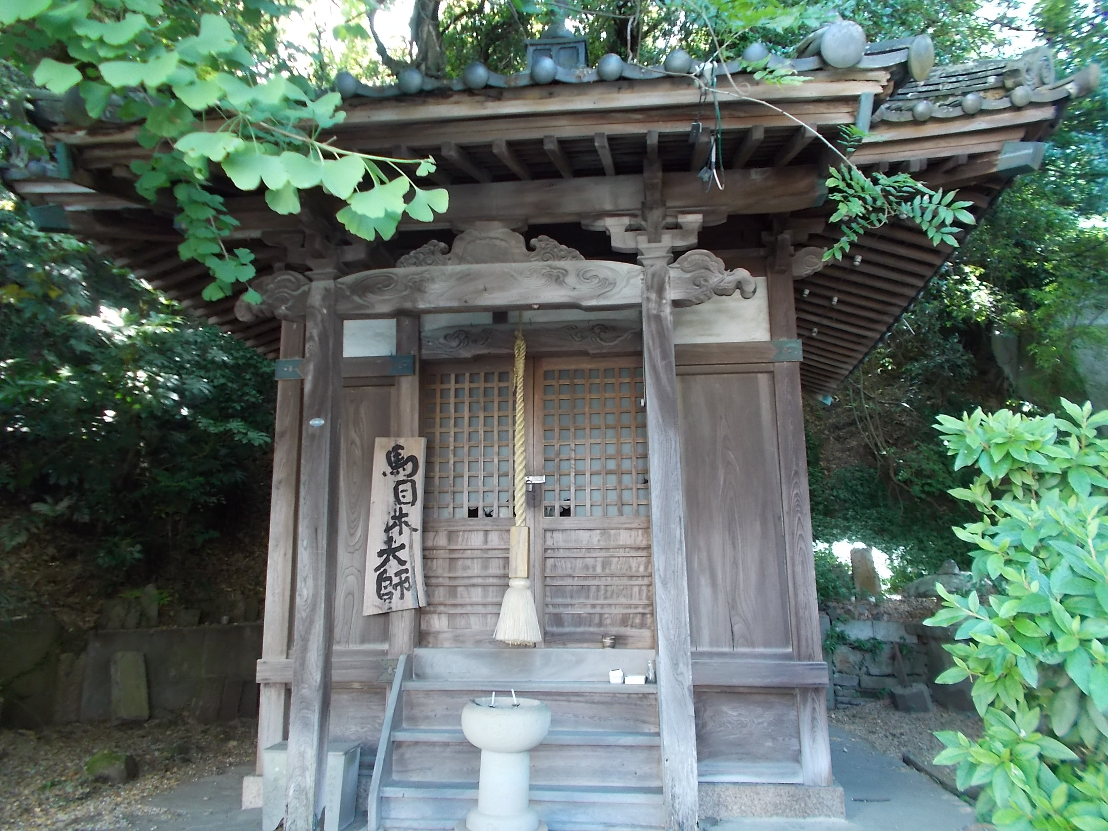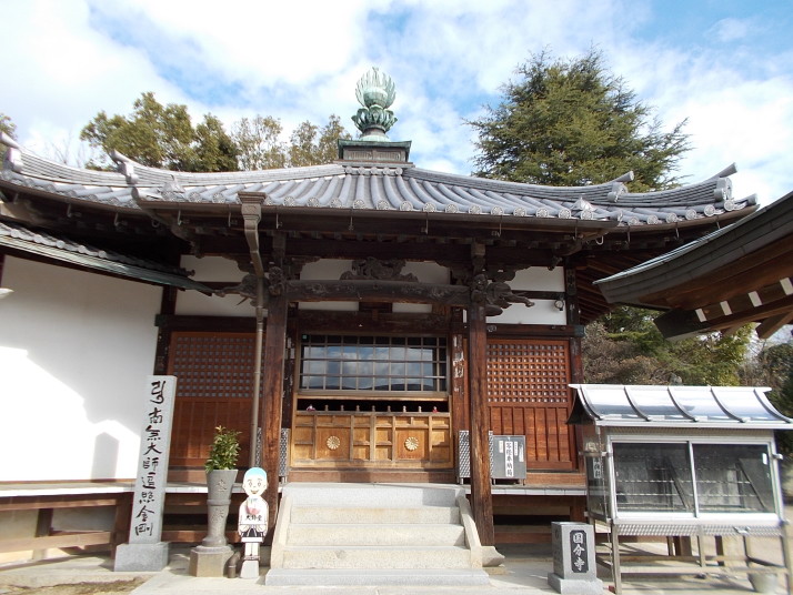 山門から階段を上ると最初に茅葺の鐘楼が目に入る。鐘を撞き、お経を唱えた。境内は広い。本堂、大師堂のほか、聖徳太子堂、大黒天などのお堂が並んでいる。