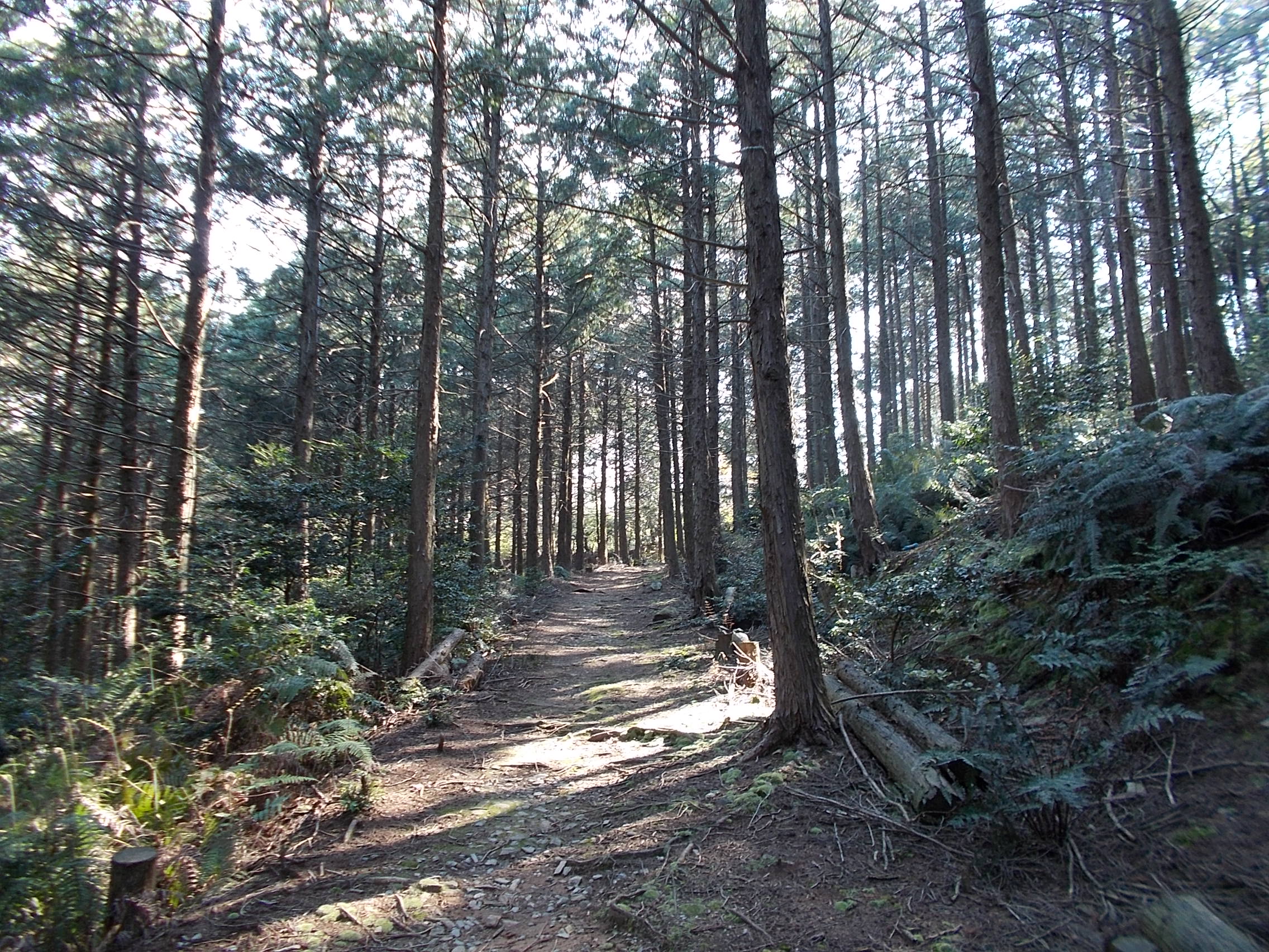 龍光寺の傍らにある墓地を抜け山道に入る。登り口には、「右に四丁丘を越す」の石柱があった。1丁(町)109m、4.4km程度のようだ。遍路道は木陰になり、山中は涼しく気持ちが良い。山中の遍路道では、音がしない。蝉の声すらしない。暫く歩くと、僅かに遠くに車の音が聞こえた。心が落ち着く束の間を歩いた。